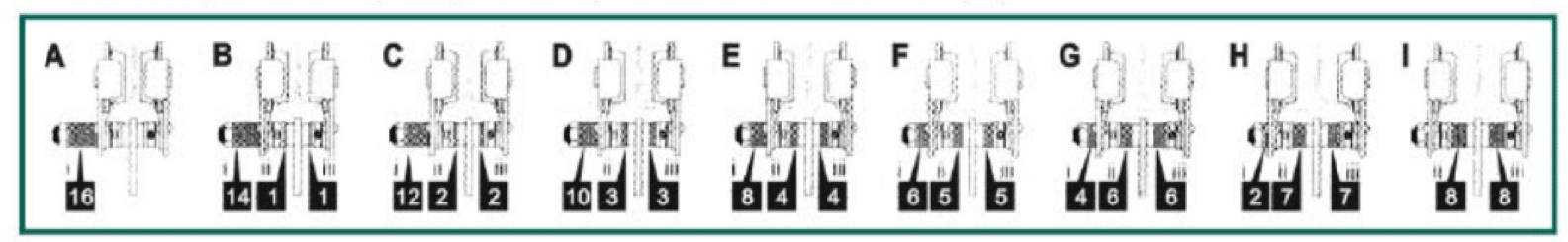 Measure the rail width. Locate the rail width in the row corresponding to the trolley size to find the washer combination category (A to I) for that trolley size. Then refer to the illustration corresponding to the washer combination category for the number of washers and washer placement needed to adjust the trolley size. (See the separate table for 10-ton trolleys.)